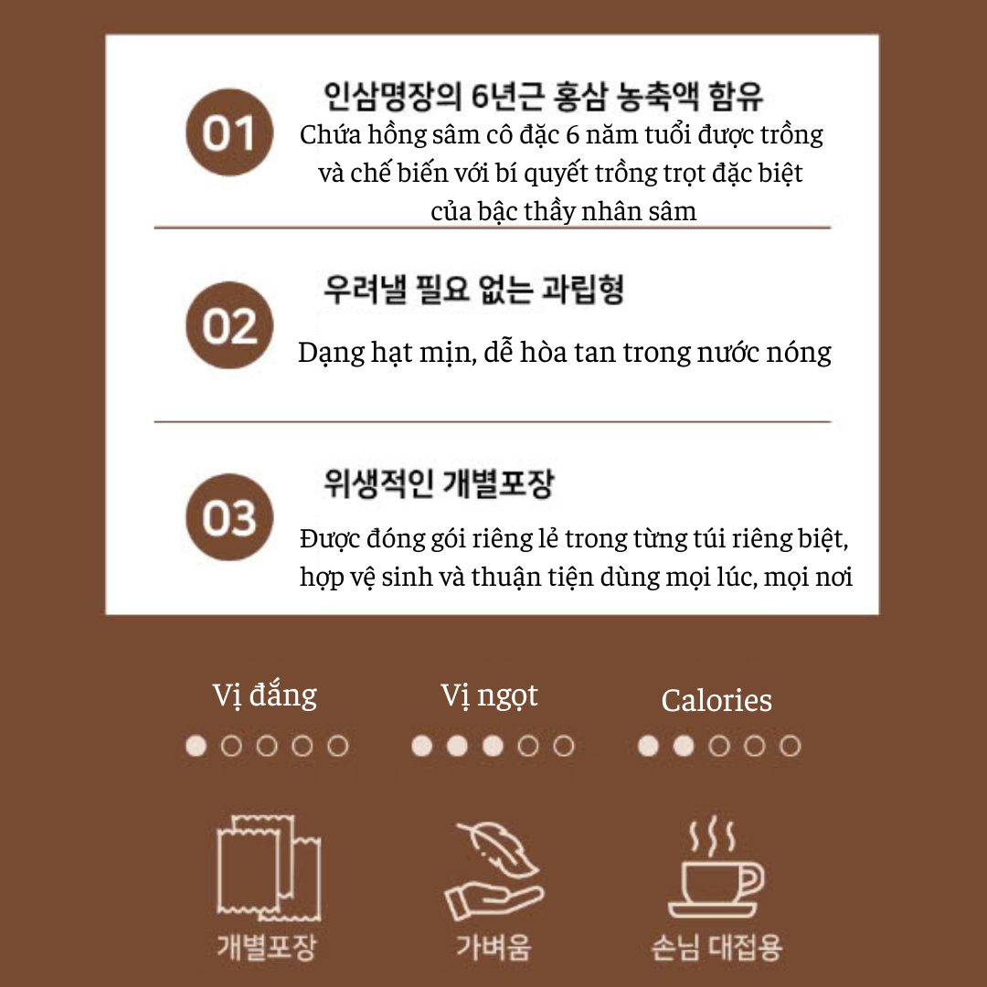 Thành phần | 6-year-old Red Ginseng Concentrate (Ginsenoside Rg1, Rb1, Rg3 (total of 4mg/g), Solids 65%, Korean) 10%, Glucose 88%, Jujube Concentrate (Jujube, Korean) 2% |